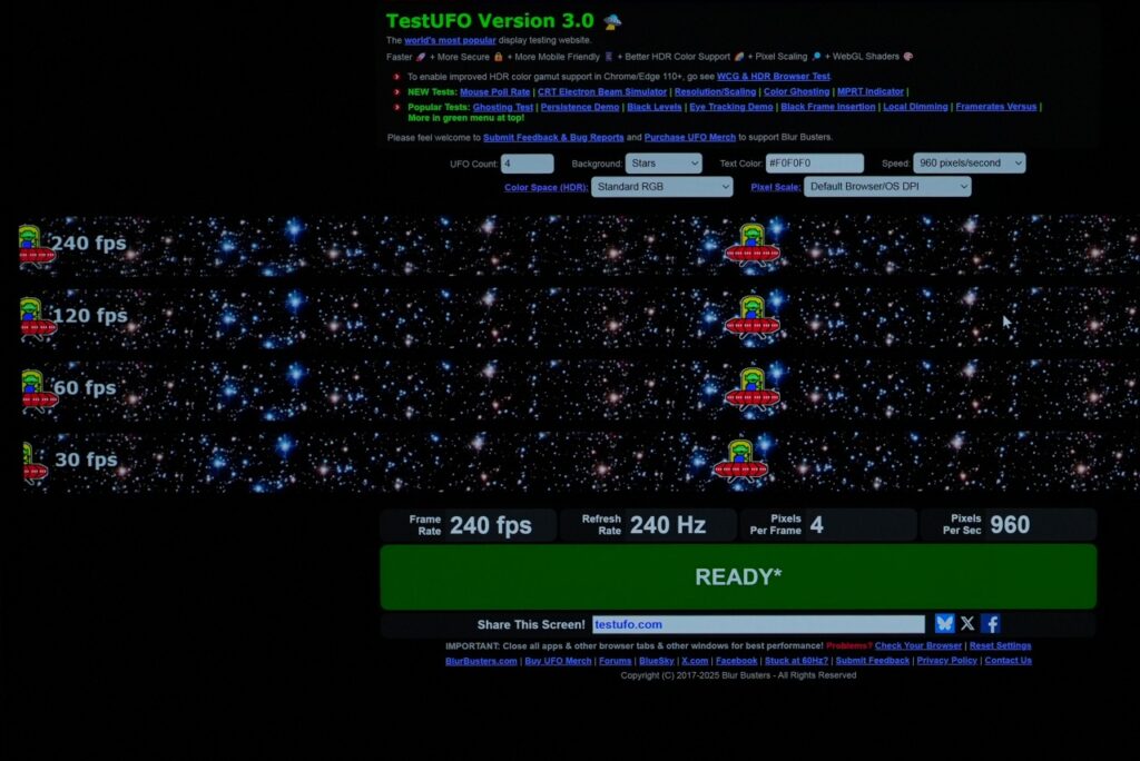 因此在用到OLED螢幕下AG276UZD的表現就非常不錯,在筆者利用相機1/240快門下可以看到,UFO TEST測試中 240FPS拍攝的影像非常清晰,公仔的邊緣沒有殘像及毛邊,就算去到最慢的30FPS測試下,公仔仍清楚可見。