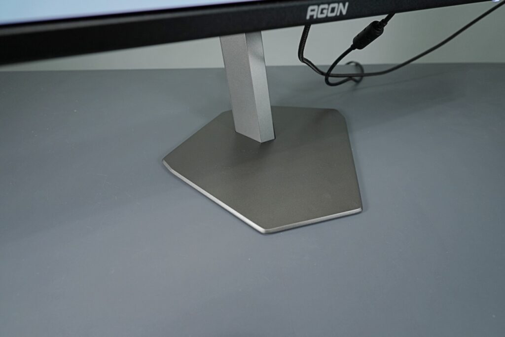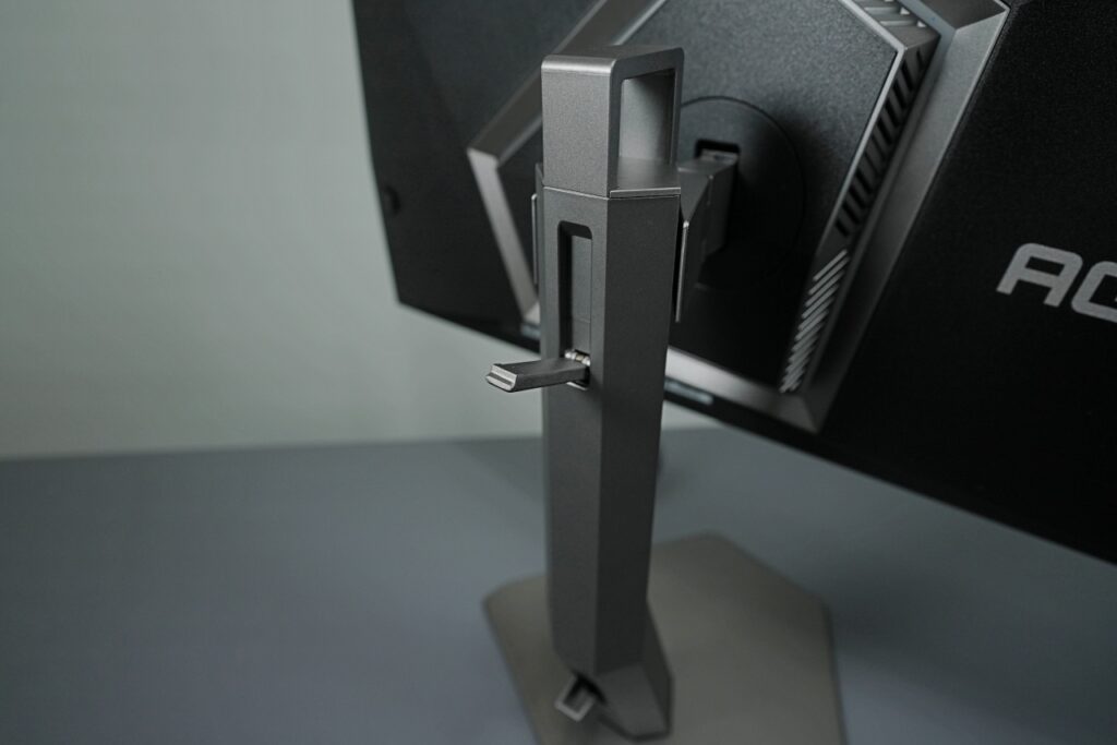 雖然市面很多螢幕以高Hz表現來吸引遊戲玩家,但AG276UZD就算是少數連物理上都為玩家著想的設計。其所使用的直降支架的不規則底座設計就方便會將鍵盤打斜使用的玩家。而且支架部份並有向後延伸以增加玩家與螢幕間的距離,至於支架除了可以垂直升降以左右擺動之外,設計上螢幕更提供90度旋轉功能,雖然對針對遊戲為先未必人人用到,但原廠提供當然來者不拒。最後,支援後更有耳機掛架,對於螢幕並非貼牆的用家則非常實用,在機背的RGB點綴下,則為螢幕多帶一點電競感。