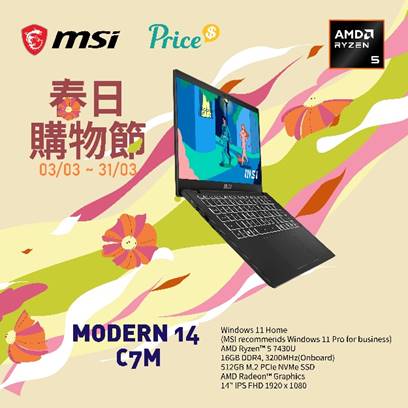 優惠連結: https://shop.price.com.hk/msi_hk/product/2276063-%E7%8D%A8%E5%AE%B6Code%E5%BE%8C4299+MSI+%E5%BE%AE%E6%98%9F+Modern+14+C7M+%E7%AD%86%E8%A8%98%E5%9E%8B%E9%9B%BB%E8%85%A6+%23Ryzen%E2%84%A2+5+7430U+%23Radeon%E2%84%A2+Graphics+%2314+%23FHD