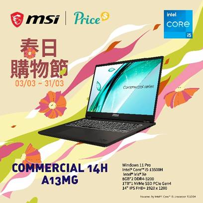 優惠連結: https://shop.price.com.hk/msi_hk/product/2275930-%E7%8D%A8%E5%AE%B6Code%E5%BE%8C4899+MSI+%E5%BE%AE%E6%98%9F+Commercial+14+H+A13MG+vPro+%E7%AD%86%E8%A8%98%E5%9E%8B%E9%9B%BB%E8%85%A6+%23i5-13500H+%23Intel%C2%AE+Iris%C2%AE+Xe+%2314+%23FHD%2B